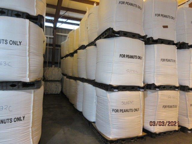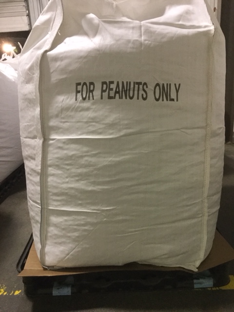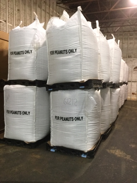 In Birdsong’s production operation, shelled peanuts are placed in large polypropylene tote bags. A single tote bag is placed on a pallet, and the pallet is sent off to a cold storage area. There the pallets are stacked four high to maximize space.